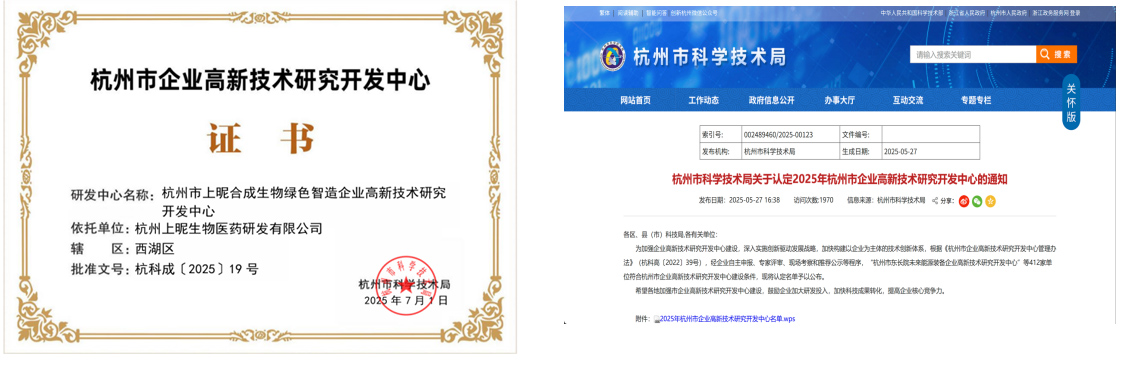 5 月 27 日,杭州市科学技术局发布了2025年杭州市企业高新技术研究开发中心的通知,杭州上昵生物医药研发有限公司经严格评审及公示等程序,成功获得市企业高新技术研究开发中心证书,研发中心名称为“杭州市上昵合成生物绿色智造企业高新技术研究开发中心”。