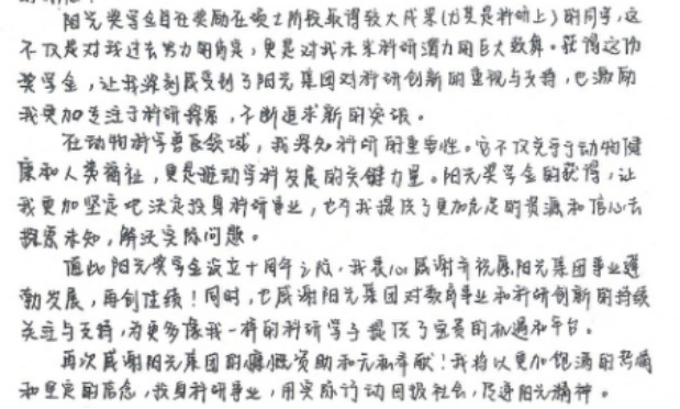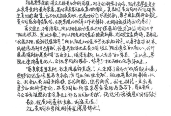 “阳光奖学金” 的意义,远不止于经济支持。几年间,我们持续收到浙大师生的感谢信,“阳光科技,慧泽桃李” 的标题里,藏着太多成长蜕变:有学生因奖学金安心投身科研,突破实验瓶颈;有学子借这份支持,走出国门交流,拓宽学术视野…… 这些反馈,让SUNNY生物更坚定“育人同行者”的角色。