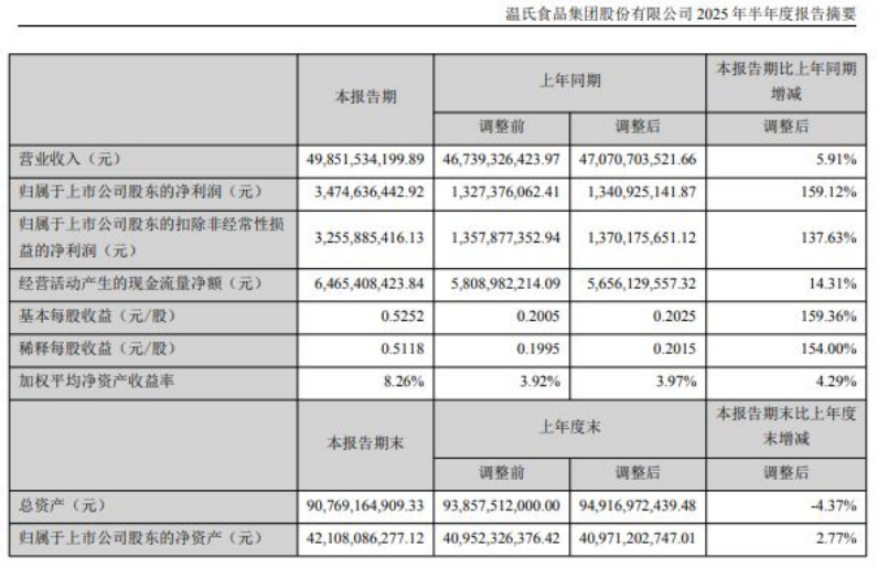 8月28日,温氏股份发布2025年半年度报告。上半年,公司实现归属于上市公司股东的净利润约34.75亿元,同比增长159.12%。猪业成为利润核心引擎,上半年养猪业务盈利约51亿元,肉猪养殖综合成本降至6.2元/斤,同比大幅下降约1.2元/斤。