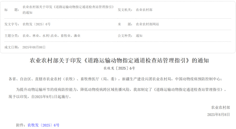 9月1日实施的《道路运输动物指定通道检查站管理指引》显著强化运输环节疫病防控,细化检疫证明、畜禽标识等查验内容,规定不合格情况处理流程,要求农业农村、公安、交通等部门协同作战。该指引有助于降低动物疫病通过运输环节传播的风险,保障畜牧业健康发展。